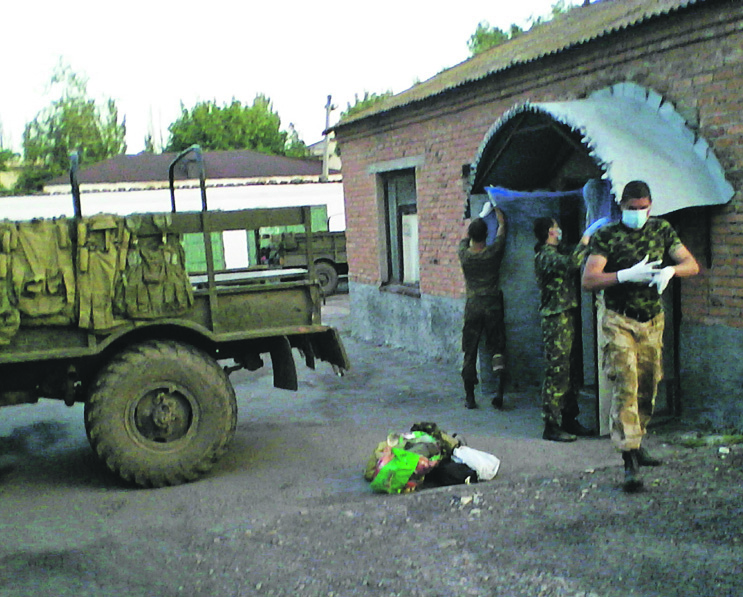 «Mūsu vienība brauc ar GAZ–66 kravas automašīnu pa kauju vietām un savāc līķus. Protams, izvedam arī ievainotos, ja tādus izdodas atrast un izglābt,» savu lomu raksturo kareivis Tarass (vārds mainīts). Viņa vienība šeit atsūtīta ārstēt nervus, nevis fiziskus ievainojumus. Un iemesls redzams viņa fotogrāfijās: līdz neiespējamībai apdeguši līķi, gabalos sarauti cilvēku ķermeņi, putrā samaltas orgānu atliekas. Tas viss ir Krievijas piegādātās artilērijas darbs – tā šauj neskatoties, vai apšaudes zonā ir ienaidnieki, savējie vai civiliedzīvotāji.
