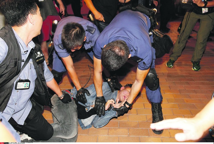 Policija pavēstījusi, ka nakts sadursmēs ievainojumus guvuši četri darbinieki, bet aizturēti 45 protestētāji. Īpaši uzsvērts, ka pret viņiem nav vērsta vardarbība. Taču policistu spārdītais Pilsoniskās partijas aktīvists Kens Cangs apgalvojis, ka policisti viņu situši arī pēc nogādāšanas iecirknī. Vakar viņš atradās vienā no Honkongas slimnīcām, kur veikta ekspertīze, lai noskaidrotu, cik smagi piekauts demonstrants, ziņo AP. «Honkongas policija šodien kļuva vājprātīga, personīgi sodot aizturēto. Policijas vadība ir pilnībā sagrāvusi Honkongas vērtības un likuma varu,» sarunā ar AP ļoti kritiski noskaņots bijis vietējā parlamenta deputāts Lī Čeukjaņs.