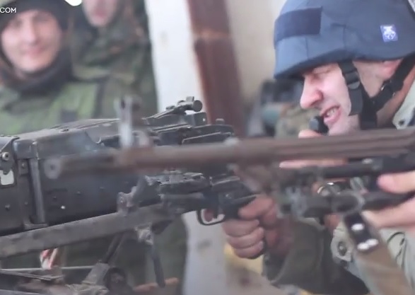 Internetā parādījies video, kurā Krievijā pazīstamais aktieris Mihails Porečenkovs apmeklē promaskaviskos kaujiniekus Donbasā un pie Doņeckas lidostas no lielkalibra ložmetēja apšauda Ukrainas spēku pozīcijas.