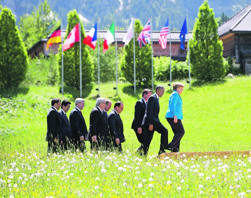 Vakarrīt Minhenes lidostā cita pēc citas ieradās augsto viesu – ASV, Lielbritānijas, Francijas, Itālijas, Kanādas un Japānas – delegācijas, kā arī ANO, ES, Starptautiskā Valūtas fonda, Pasaules bankas un Pasaules Tirdzniecības organizācijas amatpersonas, kas arī aicinātas uz tikšanos. Reuters norāda, ka īpašu uzmanību no namamātes, Vācijas kancleres Angelas Merkeles puses izpelnījies B. Obama, kurš ar kancleri ticies vēl pirms samita nelielajā Kruenas pilsētiņā. Šīs tikšanās, kuras laikā abi līderi ieturējuši brokastis bavāriešu gaumē, bet pēc tam parunājušies ar vietējiem iedzīvotājiem, mērķis ir acīmredzams – mainīt Vācijas sabiedrības viedokli par ASV pēc tam, kad kļuvis zināms, ka Nacionālā drošības aģentūra (NSA) ar vācu kolēģu palīdzību noklausījusies šīs valsts iedzīvotāju telefona sarunas un izsekojusi epasta saraksti. B. Obama mazliet uzjautrinājis vietējos iedzīvotājus ar laikus sagatavoto jociņu par to, ka aizmirsis mājās savus ādas šortus (lederhosen – daļu no tradicionālā bavāriešu tautas tērpa), bet pēc tam patētiski paziņojis, ka pašreizējās attiecības starp Vašingtonu un Berlīni esot «viena no spēcīgākajām aliansēm, kādu jebkad zinājusi pasaule», vēsta Deutsche Welle. Pievēršoties samita darba kārtībai, ASV prezidents sacījis: «Mēs gatavojamies apspriest savu kopīgo nākotni, globālo ekonomiku, kas rada darba vietas un dod iespējas, spēcīgas un pārtikušas Eiropas Savienības saglabāšanu, jaunas transatlantiskās tirdzniecības partnerattiecības, pretošanos Krievijas agresijai Ukrainā, vardarbīgā ekstrēmisma draudus un klimata pārmaiņas.»