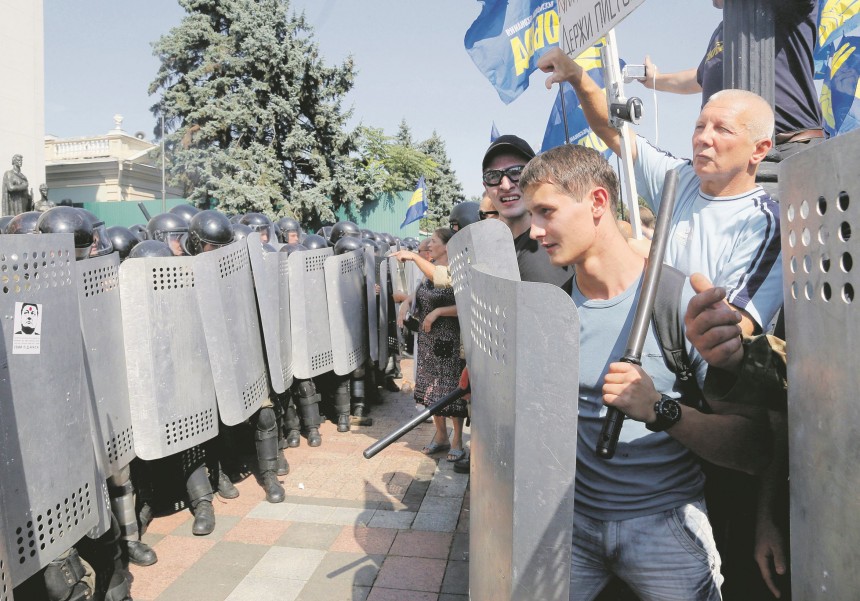 Kijevā vakar notikuši lielākie nemieri kopš Maidana laikiem. Vairāki tūkstoši cilvēku, kuri iebilduši pret plānotajiem grozījumiem konstitūcijā un pieprasījuši prezidenta Petro Porošenko demisiju, mēģinājuši doties triecienuzbrukumā parlamenta ēkai, uzsākot sadursmes ar Nacionālās gvardes spēkiem un policijas apakšvienībām. Lielāko lomu nemieros spēlējuši labējās apvienības Svoboda aktīvisti, vēsta Ukrainas mediji. Sadursmēs ievainoti vairāk nekā 100 cilvēku, vairāki Nacionālās gvardes karavīri slimnīcā nogādāti smagā stāvoklī, un vismaz viens no viņiem ir miris. Ukrainas iekšlietu ministrija notikušo nosaukusi par «terora aktu».