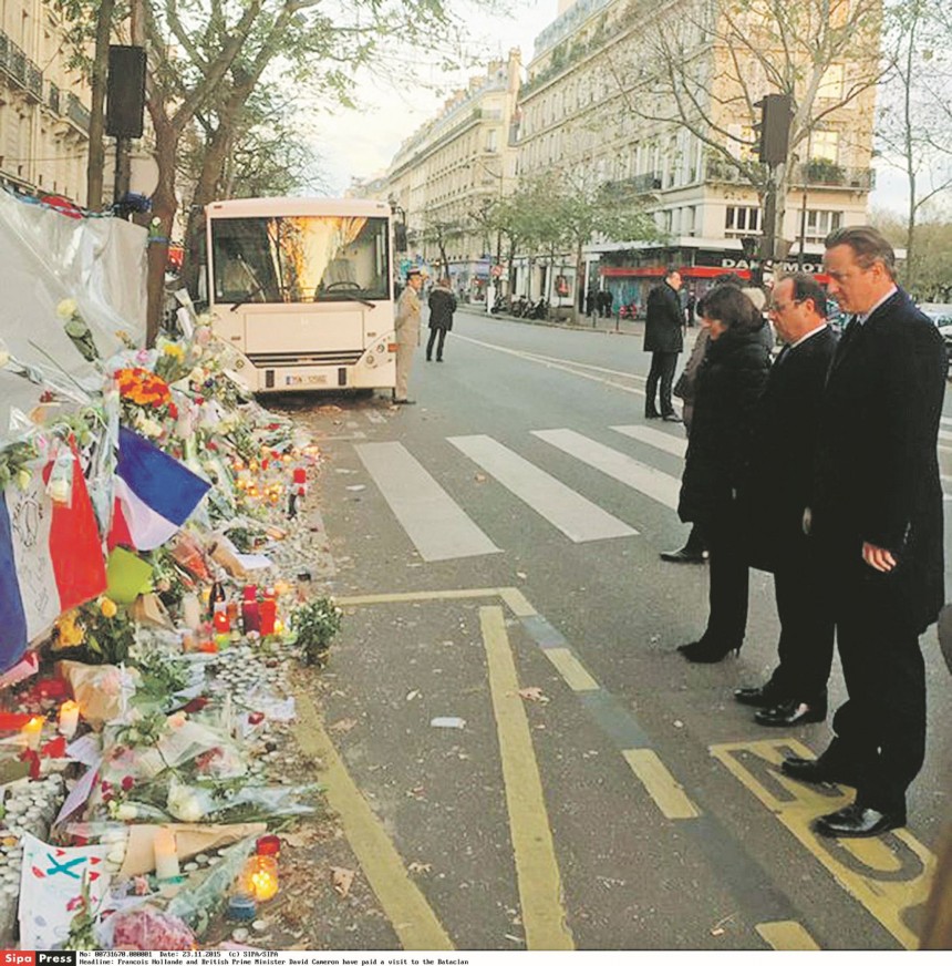Vizīti Parīzē D. Kamerons uzsāka, kopā ar F. Olandu un Parīzes mēru Annu Idalgo noliekot ziedus pie koncertzāles Bataclan, vēsta AFP. Tā bija viens no 13. novembra terora aktu rīkotāju galvenajiem mērķiem. No 130 cilvēkiem, kuri gāja bojā koordinētajos uzbrukumos, 90, to skaitā arī viens Lielbritānijas pilsonis, tika nogalināti tieši koncertzālē. Pēc Parīzē notikušajiem uzbrukumiem, atbildību par kuriem uzņēmies džihādistu grupējums Islāma valsts, tieši F. Olands uzsācis koordinēt starptautiskās sabiedrības militāro atbildi šai organizācijai, kas kontrolē diezgan plašas teritorijas Irākā un Sīrijā. Šonedēļ viņam paredzētas tikšanās ar starptautiskās politikas smagsvariem, kuri ir ieinteresēti Islāma valsts sagraušanā – ASV prezidentu Baraku Obamu, Krievijas prezidentu Vladimiru Putinu un Vācijas kancleri Angelu Merkeli.