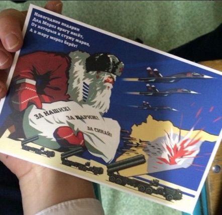 Kādā no piepilsētas skolām Krievijā, skolēni saņēmuši īpašas kartiņas uz kurām bērniem jāuzraksta Jaungada vēlējumi Krievijas karavīriem Sīrijā. Uz tās attēlots Salatēvs, kas izber raķetes uz Sīrijas ar saucienu ”Par mūsējiem, par Parīzi, par Sīnāju.”