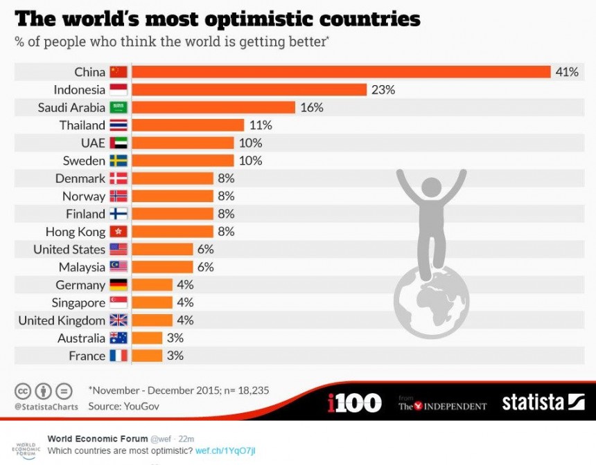 Atbildot uz jautājumu: "vai globālie procesi pasaulē virzās pareizajā un augšupejošā virzienā, visoptimistiskākie izrādījušies Ķīnas iedzīvotāji, kur šādi uzskata 41% respondentu. Otra optimistiskākā nācija ir indonēzieši ar 23%, bet trešajā vietā ierindojušies Saūda Arābijas iedzīvotāji ar 16%.