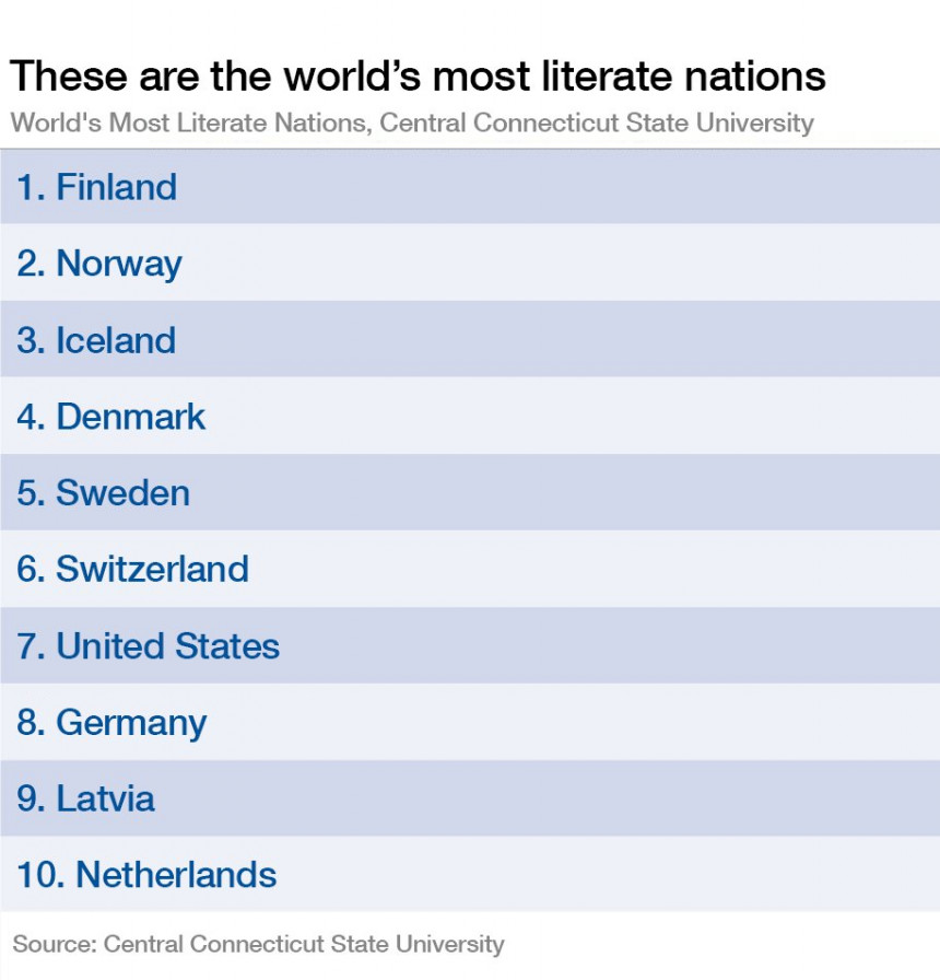 Pasaules ekonomikas forums (WEF) ir paziņojis desmit valstis, kurās ir vislabākais lasītprasmes līmenis pasaulē. Latvija ierindojas 9. vietā, uzreiz aiz Vācijas.