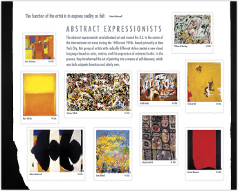 Amerikas Savienoto valstu pasts izdevis desmit marku kolekciju uz kurām attēloti mākslinieku abstrakcionistu darbi, ziņo The Los Angeles Times.