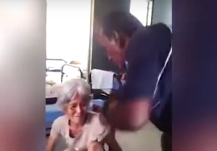 Video ir redzams, ka sieviete ir apjukusi un nobijusies, tomēr tas neattur aprūpes nama darbinieku pacelt roku pret šo sievieti.