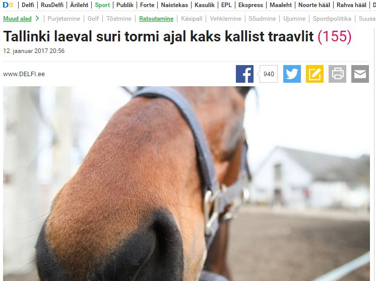Igaunijas mediji ziņo, ka vētras laikā ceļā no Helsinkiem uz Stokholmu bojā gājuši divi sporta zirgi.