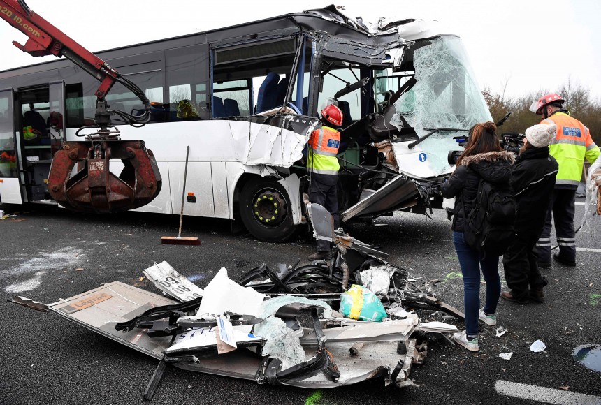 Sadursmē iesaistīti divi autobusi, smagā automašīna un vēl četras vieglās automašīnas. Kopumā ievainoti 65 cilvēki, taču pieci ir smagā stāvoklī. Negadījumu izraisīja autobusu un smagās automašīnas sadursme, kam sekoja vēl četru auto avārija