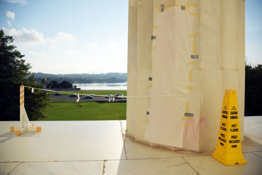 Dienests izmanto maigu krāsas noņēmēju, lai notīrītu ASV 16. prezidentam veltīto memoriālu.