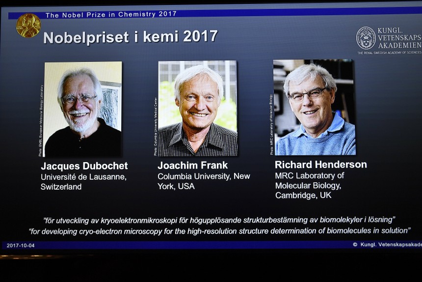 Šī gada Nobela prēmija ķīmijā trešdien piešķirta amerikāņu, britu un šveiciešu zinātniekiem par augstas izšķirtspējas krioelektroniskās mikroskopijas metožu izstrādi, kas ļauj noteikt biomolekulu struktūru.