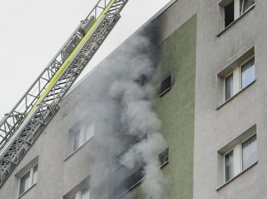 Viens cilvēks guvis smagus ievainojumus, nolecot no degošās daudzstāvu mājas jumta, ziņo aģentūra DPA.
