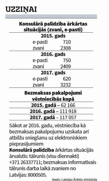Palīdzība ārkārtas situācijās kļūst arvien pieprasītāka, ārvalstīs ārkārtas situācijās nonākušo Latvijas valstspiederīgo skaits joprojām ir augsts. Tā secinājusi Ārlietu ministrija, analizējot 2017. gadu konsulārās palīdzības jomā. Pērn bija vairāki desmiti gadījumu, kad cilvēkiem vajadzēja palīdzēt atgriezties Latvijā. Kopš pagājušā gada februāra Ārlietu ministrija izveidojusi feisbuka kontu Ceļo droši, bet kopš novembra darbojas diennakts dežūru centrs.
