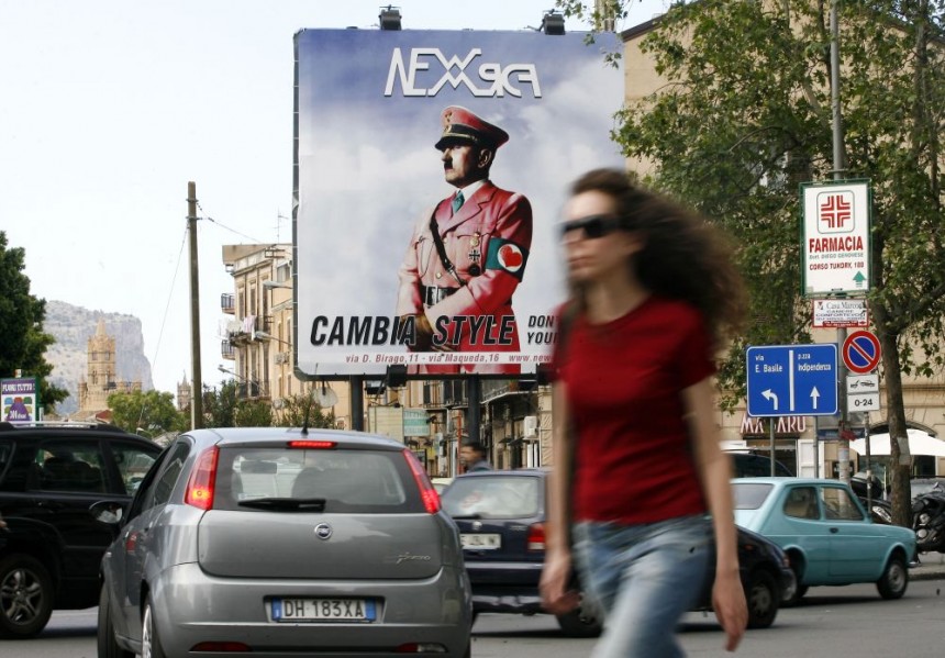 Daudzu Sicīlijas iedzīvotāju neizpratni izraisījis reklāmas plakāts, kurā Ādolfs Hitlers redzams reklamējam kādu apģērbu veikalu.