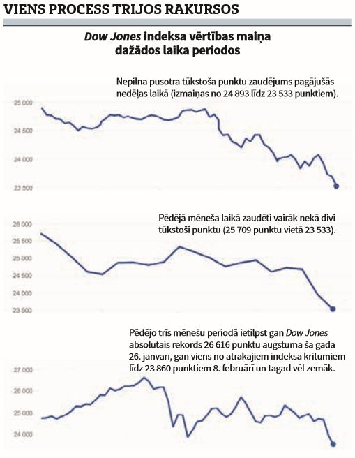 Pagājušo nedēļu Dow Jones pabeidza ar 462 punktu zaudējumu piektdienā. Tas neizskatās iespaidīgi daudz attiecībā pret atlikušajiem 23 533 punktiem un nav tik trauksmaini kā 1033 punktu zaudējums vienā tirdzniecības sesijā 8. februārī, taču ir arī argumenti, kāpēc akciju īpašnieku nepatikšanas pārskatāmā nākotnē nebeigsies un neaprobežosies ar to, ka nāksies norakstīt zaudējumos daļu no pēdējos gados uzkrātā akciju vērtības pieauguma, kas tāpat nekādu jūtamu labumu nav devis. Proti, no tādām akciju cenām, kuras labāk nemēģināt pārbaudīt, akcijas par šādām cenām pārdodot, ja vien akciju pārdošana un pirkšana netiek uzturēta līdzsvarā nemitīgos veiksmīgu un neveiksmīgu spekulāciju mēģinājumos.