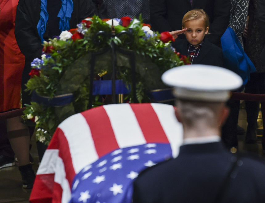 ASV prezidents Donalds Tramps un pirmā lēdija Melānija Trampa ieradās Kapitolijā vēlāk, kad atvadu ceremonija bija beigusies. Trampu pāris dažus mirkļus stāvēja pie zārka aizvērtām acīm, un pēc tam Tramps salutēja aizgājējam.