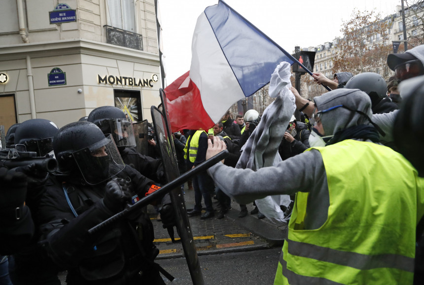 Dzeltenās vestēs tērptie protestētāji, kas pauž neapmierinātību ar Francijas prezidenta Emanuela Makrona politiku, sestdien pastiprinātā policijas apsardzībā devās gājienā uz Elizejas pili.