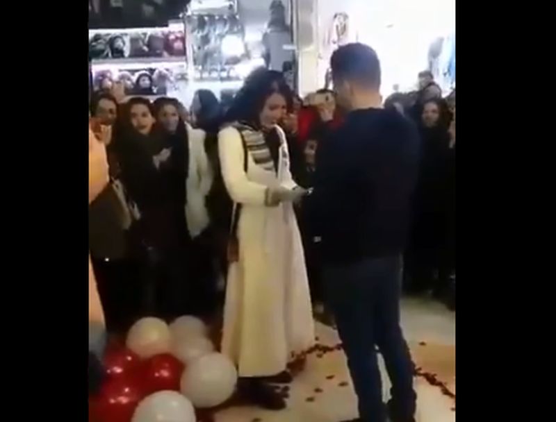 Britu raidsabiedrība BBC vēsta, ka video, kurš publicēts sociālajos tīklos redzams, ka kādā no Irānas iepirkšanās centriem pūļa klātbūtnē vīrietis bildina kādu dāmu. Pēc tam, kad dāma pozitīvi atbildējusi uz bildinājumu, sanākušie abus sveikuši ar applausiem.