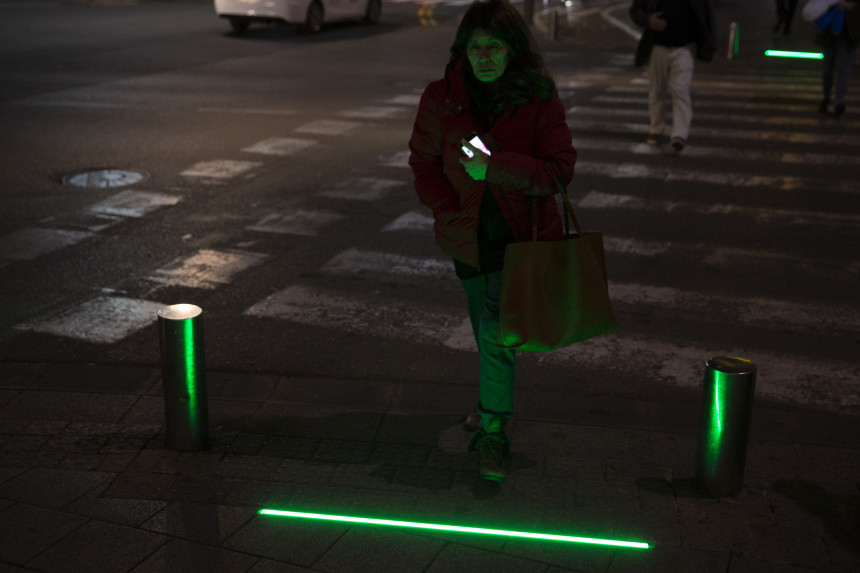 Izraēlas pilsēta Telaviva trotuāros pirms krustojumiem uzstādījusi "zombiju gaismas", lai palīdzētu gājējiem, kas pārāk iegrimuši savos viedtālruņos.