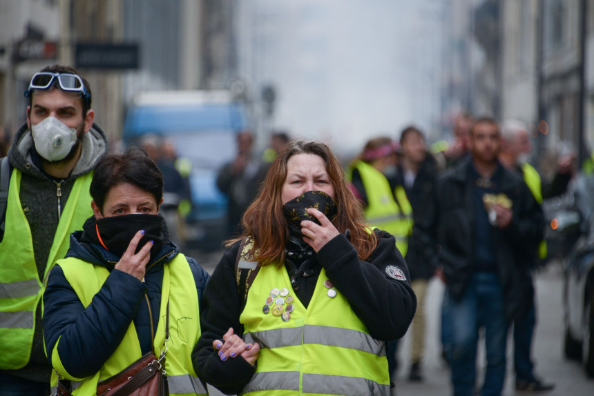 "Dzelteno vestu" kustība radās novembra vidū lauku rajonos kā reakcija uz plānotu degvielas nodokļa paaugstināšanu, bet ātri pārauga plašākā kustībā pret Makrona politiku. Protestētāji valkā atstarojošās dzeltenās vestes, no kā arī aizgūts šīs protestu kustības nosaukums.