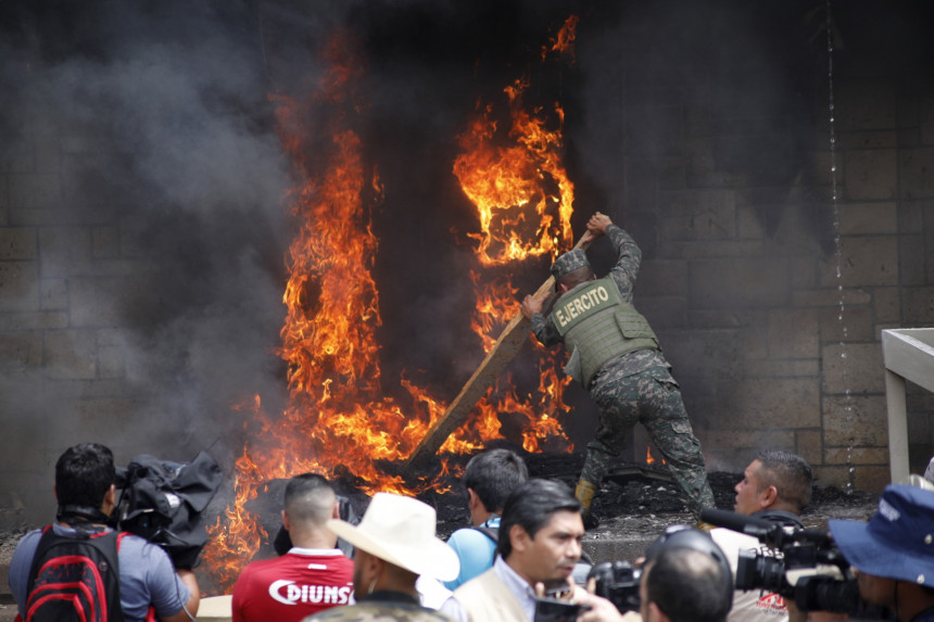 Maskējušos vīriešu izraisītajā ugunsgrēkā pie vēstniecības pacēlās liela tumšu dūmu grīste, līdz ieradās Hondurasas karavīri ar ugunsdzēšanas aparātiem.