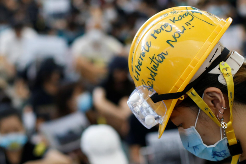 "Pajautā man par Honkongu," lasāms dažādās valodās uz norādēm, kas piestiprinātas apmēram tūkstoš akcijas dalībniekiem.