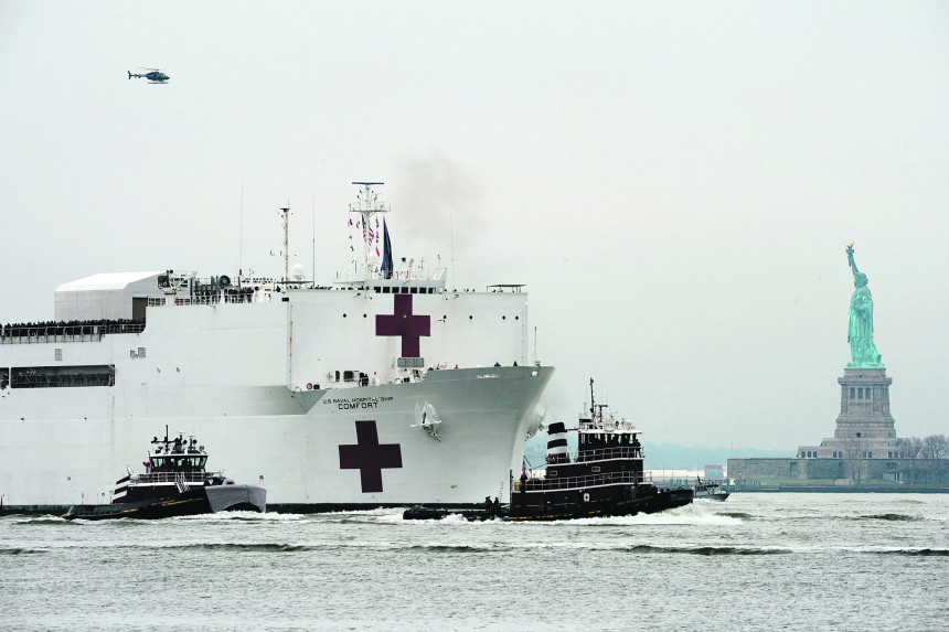 Otrdienas rītā simtiem Ņujorkas un Ņūdžersijas štatu iedzīvotāji, kas bija pulcējušies Hudzonas upes krastos, ar aplausiem sagaidīja ASV Jūras kara flotes peldošā hospitāļa Comfort ierašanos un noenkurošanos Manhetenas piekrastē, raksta Reuters. Uz šī peldlīdzekļa - pārbūvēta naftas tankkuģa - ir vairāk nekā 10 operāciju zāles un palātas aptuveni 1000 slimniekiem. Varasiestādes plāno uz tā nogādāt tos sasirgušos, kuri nav inficējušies ar koronavīrusu, lai tādējādi gan atvieglotu slogu, kas pašlaik gulstas uz pārējām slimnīcām, gan novērstu to, ka inficēšanās notiek tieši medicīnas iestādēs, uz kurām palīdzības meklējumos devušies ar citām kaitēm sirgstošie.