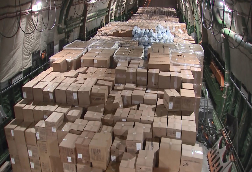Ministrijas izplatītajā video redzams, kā kravas lidmašīna, kas piekrauta ar kastēm, trešdienas rītā gatavojas izlidošanai no Piemaskavas armijas lidlauka.