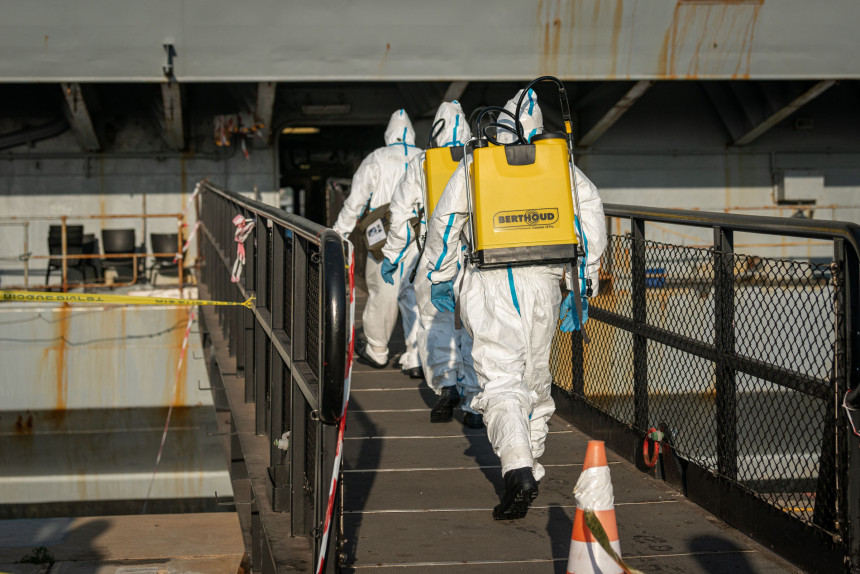 31 jūrnieks no saslimušajiem atrodas slimnīcā, paziņoja ministrija, piebilstot, ka testu veikšana turpinās.