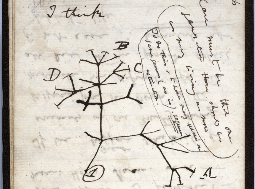 Vienā no tām Darvins uzzīmējis diagrammu, kurā attēlotas vairākas iespējas sugu attīstībai. Vēlāk viņš izstrādāja smalkāku ilustrāciju, ko 1859.gadā publicēja grāmatā "On the Origin of Species" ("Sugu izcelšanās").