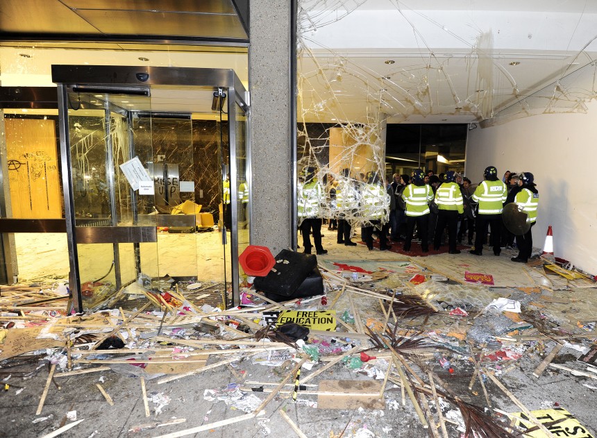 20 studenti ielauzušies konservatīvās partijas biroja vestibilā, kur starp viņiem un policistiem notikusi sadursme. Policija nekārtību cēlājus ieslēgusi biroja telpās, bet viņiem izdevies izsitot stiklus izkļūt laukā.