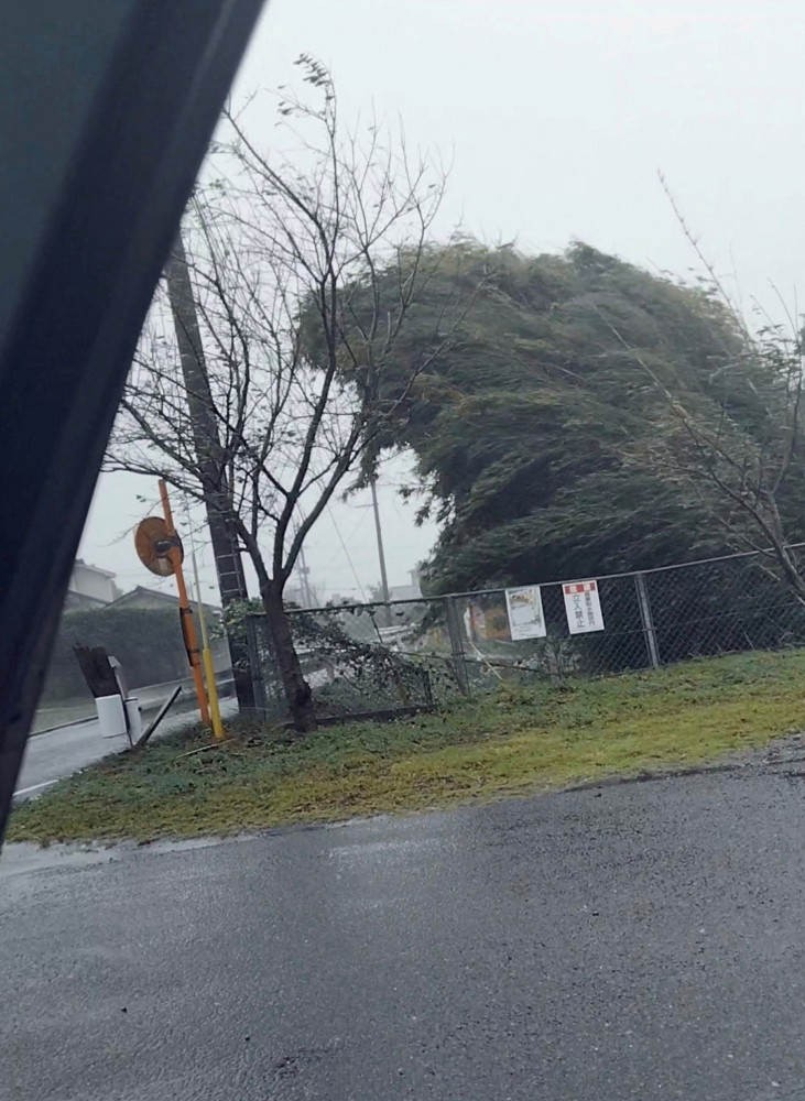 Kjusju salu jau skāris spēcīgs lietus un vējš, kā rezultātā bez elektroapgādes palikušas jau gandrīz 98 000 mājsaimniecību.