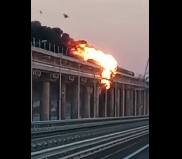 Ukrainas prezidenta biroja vadītāja padomnieks Mihails Podoļaks intervijā jūlijā paziņojis, ka Krimas tilts, ko Krievija uzcēla pēc pussalas okupācijas, ir jāiznīcina kā leģitīms Kijivas militārs mērķis. Šobrīd tad deg, liecina pravda.com.ua informācija.