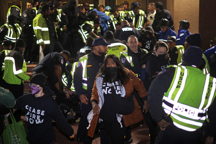 Sociālajos medijos ievietotās fotogrāfijās bija redzami protestētāji melnos T-kreklos ar baltu uzrakstu "Cease Fire Now" ("Pārtraukt uguni tagad"), kas cīnījās pret policistiem, kuri mēģināja viņus padzīt no ēkas ieejas.