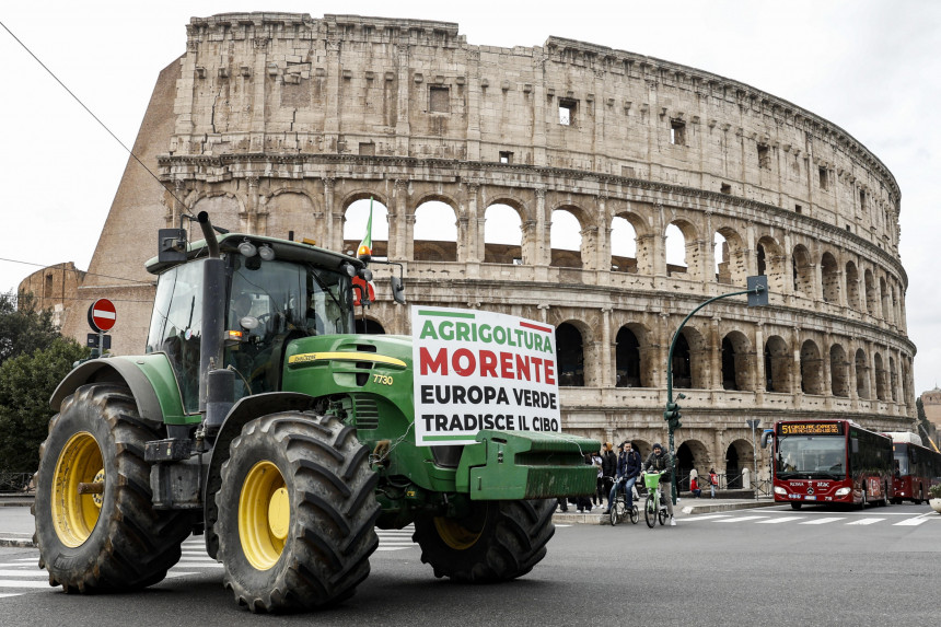 Itālijas lauksaimnieki, kuri iepriekšējās nedēļās rīkoja mazākas demonstrācijas visā valstī, piektdien ar četriem traktoriem protestēja Romā pie Kolizeja.