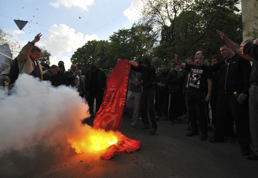 Ukrainas pilsētā Ļvovā šodien, 9. maijā, sākušies nemieri, pilsētas administrācijas ēkas priekšā jauniešu grupa sadedzinājusi bijušās PSRS simboliku - sarkano karogu, ziņo Ukrainas mediji.