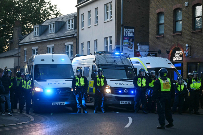 Policija paziņoja, ka par vardarbīgām nekārtībām mītiņā pie viesnīcas "Bell Hotel" Londonas ziemeļaustrumu rajonā Epingā aizturējusi piecus cilvēkus.
