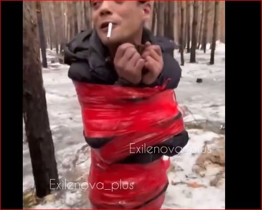 Kareivji ietin "grēcinieku"no pleciem līdz potītēm sarkanā plēvē un piesien pie koka - paši to ironiski nodēvējuši par «eglītes izrotāšanu».