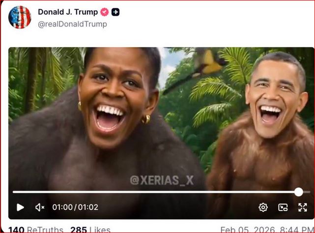 ASV prezidents Donalds Tramps ceturtdien platformā "Truth Social" publicējis video, kurā bijušais prezidents Baraks Obama un viņa sieva Mišela attēloti kā pērtiķi.