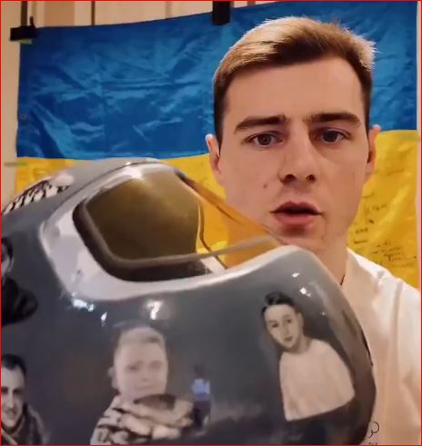 Heraskevičs, kurš ir Ukrainas karognesējs un piedalās lielākajā Ukrainas delegācijā pēdējo 16 gadu laikā, ķiveri valkāja treniņos Kortīnā d'Ampeco. Uz tās redzami portreti, tostarp svarcēlājas Alīnas Peregudovas, boksera Maksima Haliničeva, daiļslidotāja Dmitrija Šarpara un citu Ukrainas sportistu foto, kuri zaudējuši dzīvību kopš 2022. gada Krievijas iebrukuma.