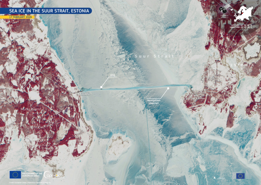 Attēls uzņemts 2026. gada 17. februārī ar vienu no “Copernicus” Sentinel-2 satelītiem. Tajā redzams plašs ledus klājums Suur-Vēnas šaurumā, kas atdala Igaunijas kontinentālo daļu no Muhu salas, un šaura, tumšāka josla - kuģojamais kanāls, pa kuru kursē prāmis maršrutā Virtsu-Kuivastu. Kuģa atstātā taka ledū ir skaidri saskatāma pat no gandrīz 800 kilometru augstuma.
