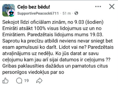 Kā vēsta informācija Latvijas nacionālā aviopārvadātāja “airBaltic” mājaslapā, “Lidojumi uz un no Dubaijas ir atcelti līdz 2026. gada 16. martam (ieskaitot). Atcelts arī 17. martā plānotais lidojums BT792 no Dubaijas uz Rīgu.”