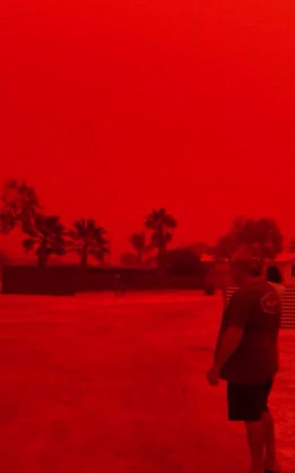 Vēja brāzmas pacēla sarkano tuksneša putekļu mākoņus, kas, izkliedējot saules gaismu, filtrēja īsākos viļņu garumus un pastiprināja sarkano spektru, radot apokaliptisku skatu.