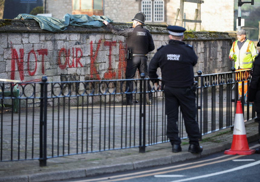 Tikai dažas stundas pirms Lielbritānijas karaļa Čārlza III ierašanās uz Lieldienu dievkalpojumu Sentesafā Velsas ziemeļos ceturtdien nācies aizklāt uz dievnama sienas uzķēpāto grafiti "Ne mūsu karalis".