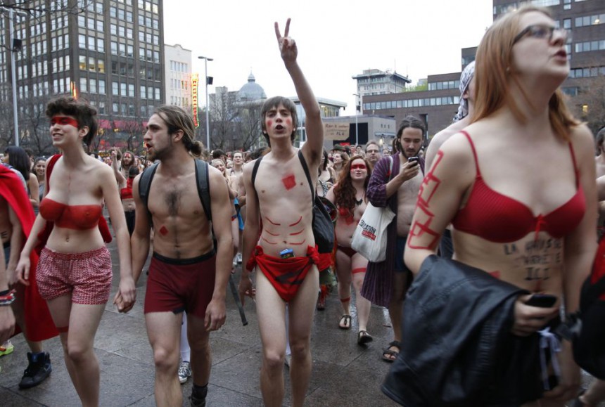 Tūkstošiem gandrīz kailu Kanādas studentu ceturtdien izgāja nemīlīgi vēsajās Monreālas ielās, lai protestētu pret mācību maksas paaugstināšanu.