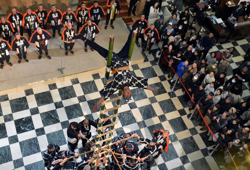 Tērpušies 19. gadsimta Japānas ugunsdzēēju tērpos, lielveikalu nolīgti akrobāti uz bambusa kāpnēm veic kādu senu tradicionālo triku, kas raksturīgs Jaungada svinībām.