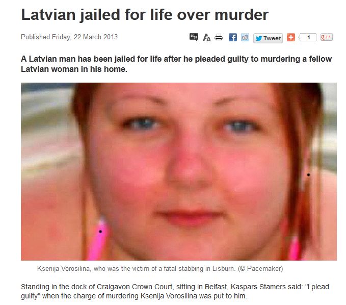 Ziemeļīrijā par dzīvesbiedres nogalināšanu notiesāts Latvijas pilsonis, kuram piespriests mūža ieslodzījums, vēsta laikraksts "Belfast Telegraph".
