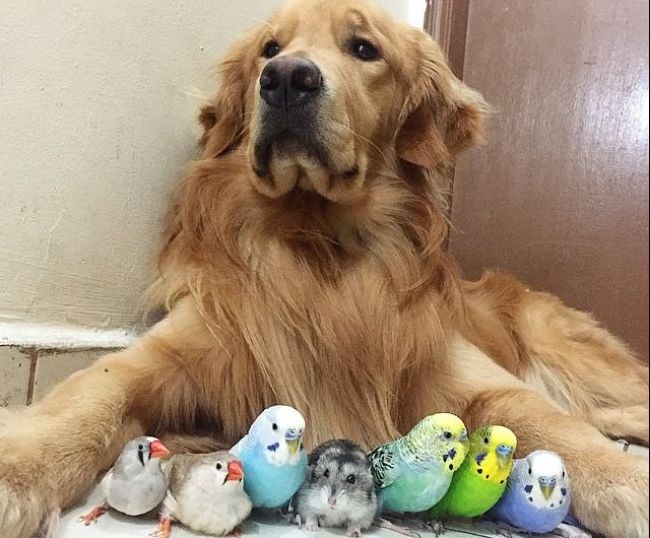 Zeltainais retrīvers Bobs ļoti labi sadzīvo vienā mājoklī ar ziņkārīgo kāmi un žiperīgajiem papagaiļiem. Arī mazās radībiņas no augumā lielā suņa nebaidās. Šo jauko draudzību iemūžinājis dzīvnieku saimnieks.