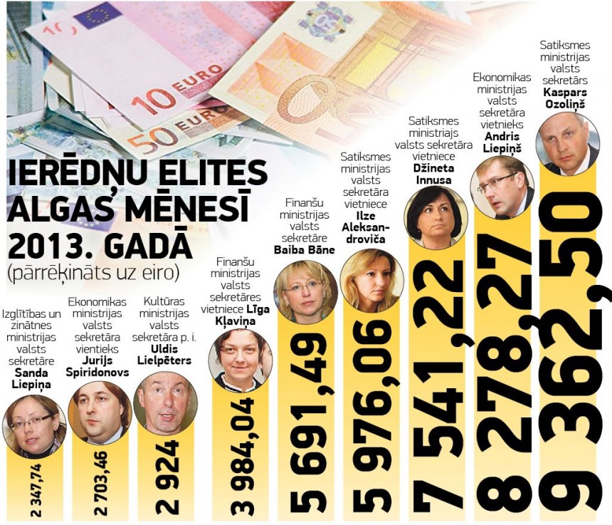Prokurors, Latvijas pārstāvis Eirojustā Gunārs Bundzis – 10 900 latu mēnesī. Latvijas Bankas valdes loceklis Raivo Vanags – 10 250 latu. Bankas Citadele valdes priekšsēdētājs Guntis Beļavskis – 8500 latu mēnesī. Latvijas Bankas prezidents Ilmārs Rimšēvičs – 6800 latu mēnesī. Latvijas Bankas valdes priekšsēdētājs (ir arī šāds amats!) Māris Kālis – 6400 latu.