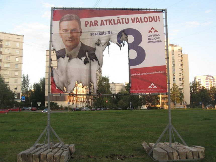 Latvijas Reģionu Apvienība paudusi sašutumu par to, ka Rīgā, Zolitūdē, Anniņmuižas ielā naktī no 15. uz 16.septembri tika nodedzināti, bet naktī no 21. uz 22. datumu - arī sagriezti četri vides reklāmas plakāti ar Latvijas Reģionu Apvienības Saeimas deputātu kandidātu Mārtiņa Šica un Mārtiņa Bondara foto.